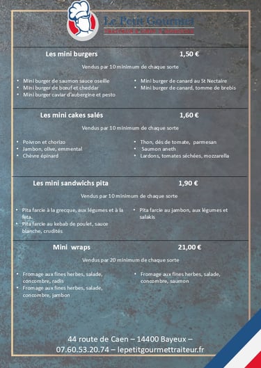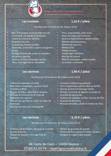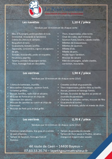 Navettes, burgers, wraps, mille feuille, canapés, verrines...