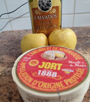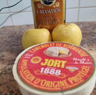 Viande de porc Française, sel, poivre, muscade, pomme, camembert et calvados