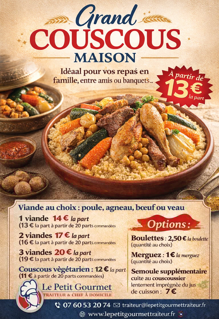********Devant le succès remporté par notre couscous, nous vous conseillons de passer vos commandes le plus tôt possible car souvent le carnet de commandes est plein d'une semaine à l'autre.*******