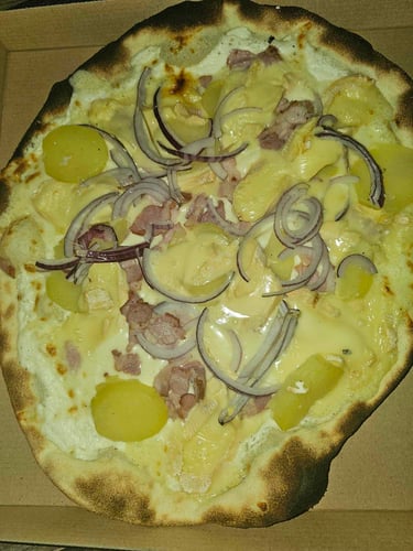 Crème fraîche AOP d’Isigny, mozzarella (47% de matières grasses), pommes de terre, oignons rouges, lardons, reblochon AOP