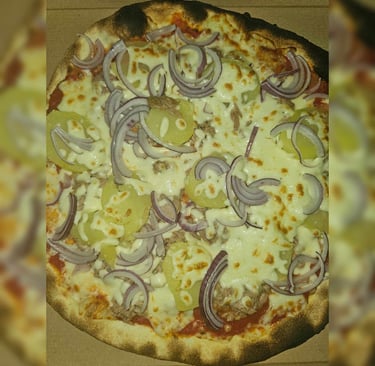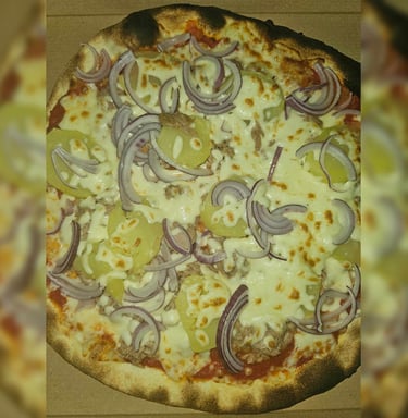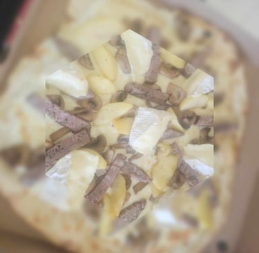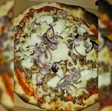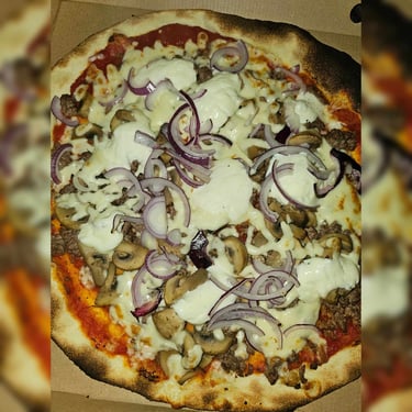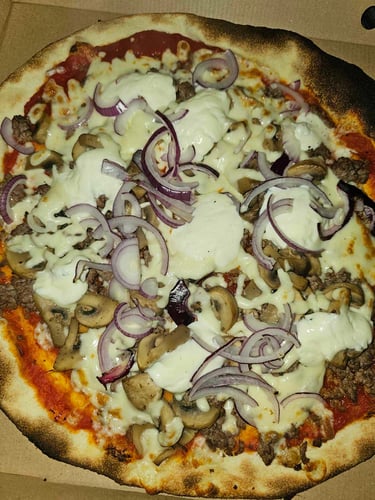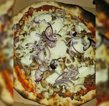 Tomate, viande hachée Française, oignons rouges, Crème fraîche AOP d’Isigny, champignons, mozzarella (47% de matières grasses)