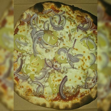 Tomate, pommes de terre, thon, Mozzarella (47% de matières grasses), oignons rouges