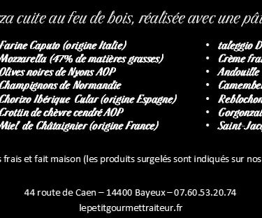 Crème fraîche AOP d’Isigny, mozzarella (47% de matières grasses), andouille de Vire, champignons frais, camembert AOP, Pommes